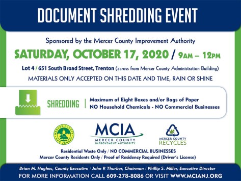 The Mercer County Improvement Authority will be hosting its October Document Shredding event this Saturday, October 17th from 9 am – 12 pm in Lot 4 of 651 South Broad Street in Trenton (across from the Mercer County Administration Building). The event will be held rain or shine.